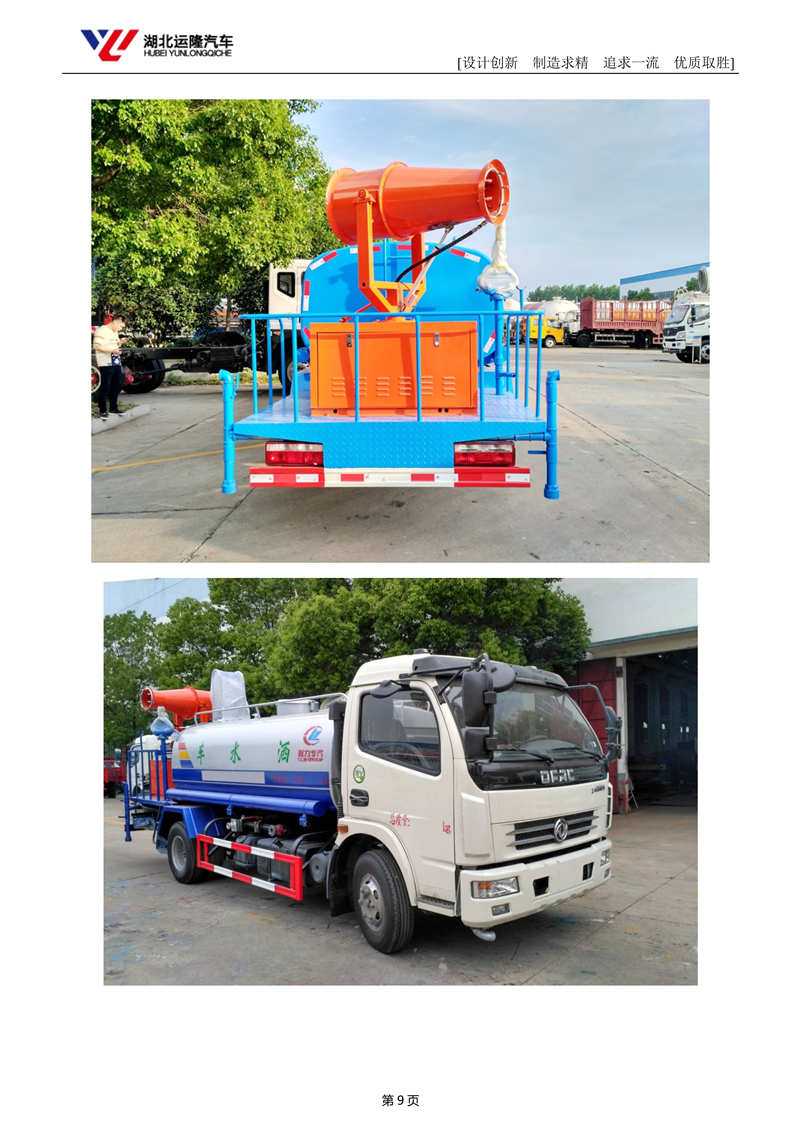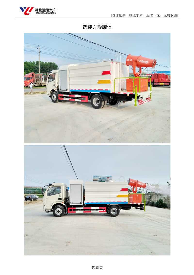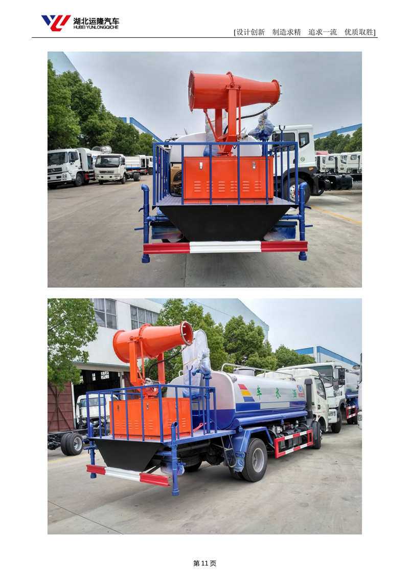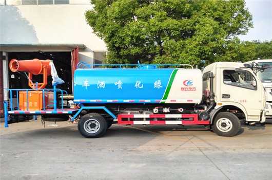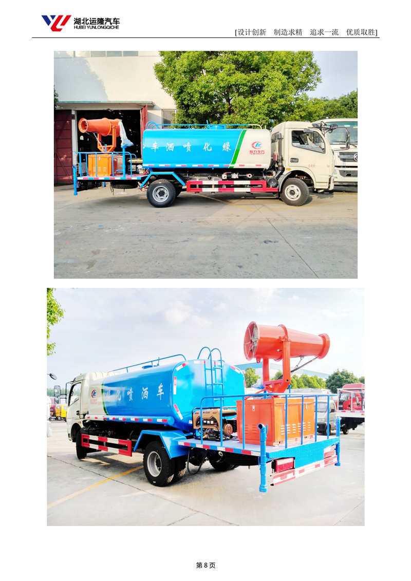 上裝配置:罐體容積為 8立方多功能抑塵灑水車(chē),風(fēng)送式霧炮機(jī)射程30米/40米,罐體鋼板為4mm碳鋼Q235材質(zhì),罐內(nèi)隔板具有防波作用,以減輕汽車(chē)行駛時(shí)罐體液體沖擊,罐體及整車(chē)外形尺寸按照公告。帶大功率專(zhuān)用灑水泵,泵可自吸自排,整車(chē)前沖、后灑、側(cè)噴、帶65消防接口,后平臺(tái)配CLW-30/CLW-40型風(fēng)送式霧炮機(jī)組;汽油/柴油發(fā)電機(jī)組;遠(yuǎn)程遙控系統(tǒng)控制;霧炮自動(dòng)旋轉(zhuǎn)角度0-360°。后平臺(tái)帶綠化灑水炮,灑水炮可全方位旋轉(zhuǎn),可連續(xù)調(diào)成直沖狀、大雨、小雨、毛毛雨;前封頭帶水位計(jì),后平臺(tái)主管路帶1寸澆花接口,后爬梯。平臺(tái)后部帶小安全告知牌:“隨時(shí)停車(chē),注意安全”,帶兩根水管及陰陽(yáng)端。罐體顏色:白/蘭/綠,罐體兩側(cè)噴“灑水車(chē)、綠化噴灑車(chē)”字樣,貼反光標(biāo)示。