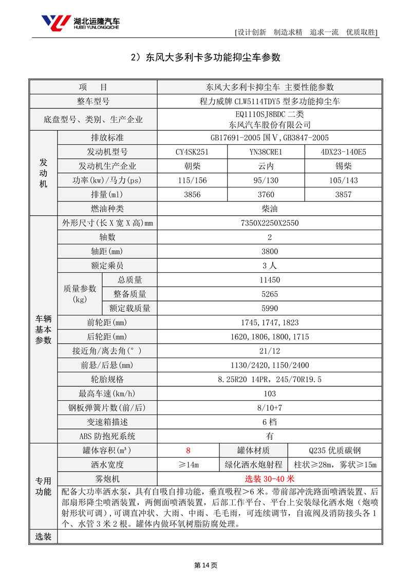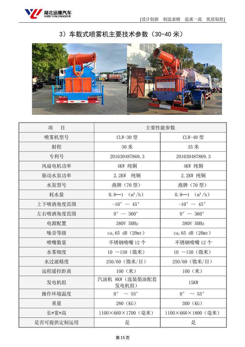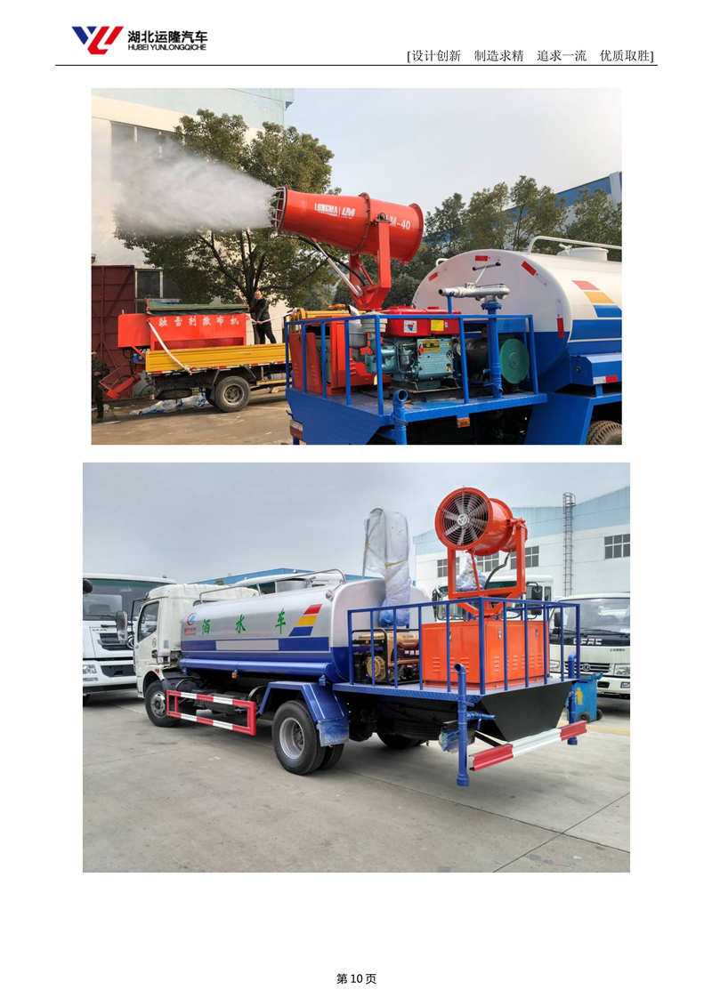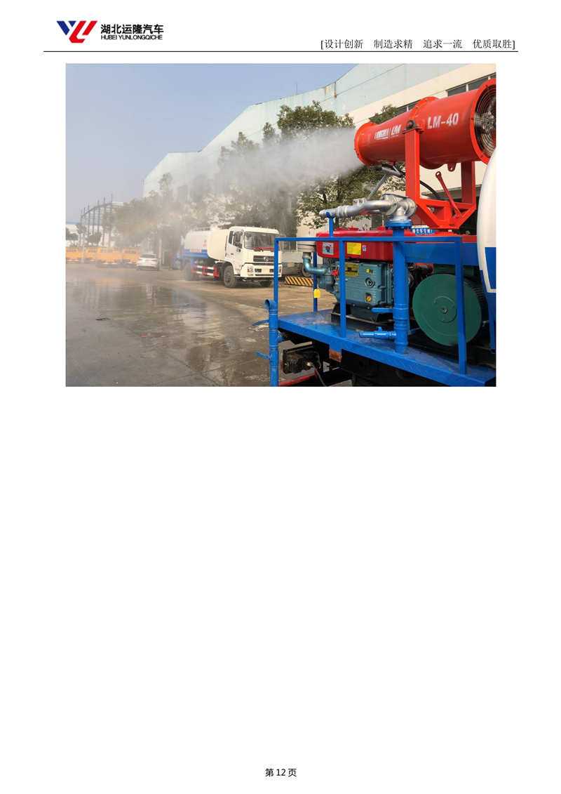 上裝配置:罐體容積為 8立方多功能抑塵灑水車(chē),風(fēng)送式霧炮機(jī)射程30米/40米,罐體鋼板為4mm碳鋼Q235材質(zhì),罐內(nèi)隔板具有防波作用,以減輕汽車(chē)行駛時(shí)罐體液體沖擊,罐體及整車(chē)外形尺寸按照公告。帶大功率專(zhuān)用灑水泵,泵可自吸自排,整車(chē)前沖、后灑、側(cè)噴、帶65消防接口,后平臺(tái)配CLW-30/CLW-40型風(fēng)送式霧炮機(jī)組;汽油/柴油發(fā)電機(jī)組;遠(yuǎn)程遙控系統(tǒng)控制;霧炮自動(dòng)旋轉(zhuǎn)角度0-360°。后平臺(tái)帶綠化灑水炮,灑水炮可全方位旋轉(zhuǎn),可連續(xù)調(diào)成直沖狀、大雨、小雨、毛毛雨;前封頭帶水位計(jì),后平臺(tái)主管路帶1寸澆花接口,后爬梯。平臺(tái)后部帶小安全告知牌:“隨時(shí)停車(chē),注意安全”,帶兩根水管及陰陽(yáng)端。罐體顏色:白/蘭/綠,罐體兩側(cè)噴“灑水車(chē)、綠化噴灑車(chē)”字樣,貼反光標(biāo)示。